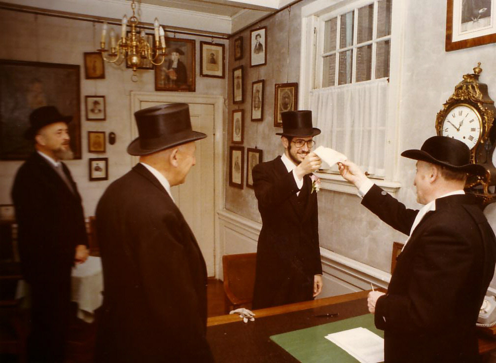[1] Calla , her mother to her left and the Chatan’s mothers to her right, take place under de hupa, Chatan with two fathers sits on the left side next to the hupa [2] Chazzan starts after Chatan announces בכבוד [3] Chatan & calla add vidui from mincha erev Yom Kippur, green tefillot for Yom Kippur, pages 6-7. Or מחחת דותר pages 61-62 [4] All sit down, Chazzan announces בכבוד [5] All are standing. A silver cup is used. The Chatan gets wine from his father; calla gets wine form her mother. (drinken door de rabbijn staat in de oude tefillot!!! Waarom doen wij dat niet meer?) [6] Chatan joins calla under
