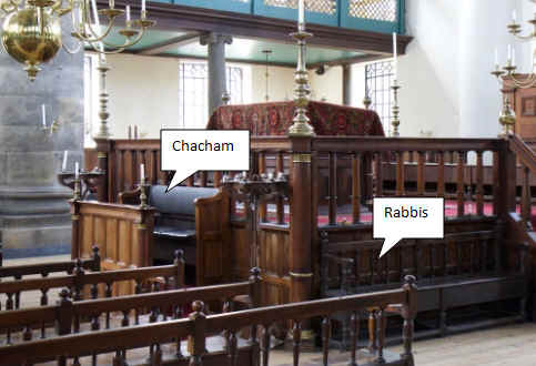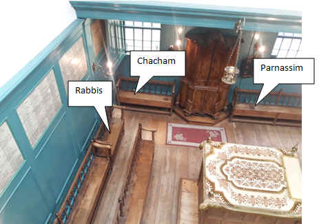 Places of officialsThere are separate benches for the Chacham and the rabbis in both synagogues.