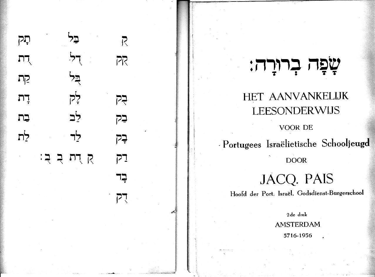 In 1956, Mr Jacq. Pais, the teacher of our community, made a booklet to teach the children Hebrew reading. The first 8 pages have Hebrew words transliterated to Dutch. Below I bring some examples. It shows how to pronounce the letters and the vowels for Dutch speakers. Although the booklet’s name is “שפה ברורה”, it was referred to as “koe doet boe boe”, the last line of the first page, see last example below. Recording of the examples (JBS)