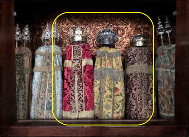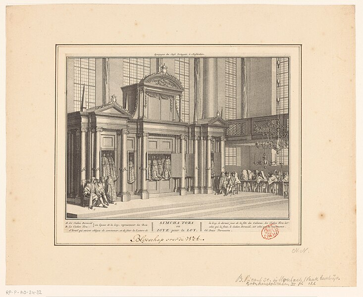 In the morning, before the reading, Sefer וזאת הברכה is brought to the Tebah by the Lavador, Sefer בראשית by the Chatan Tora and Sefer מפטיר by the Chatan Bershit. After the reading, Sefer וזאת הברכה is brougt back to the Hechal by the Chatan Tora, Sefer בראשית by the Chatan Bersihit.and Sefer מפטיר by the Lavador Two 18th century (1741) canapés are placed in front of the Hechal for the Chatanim and their acompanhador (escort), one on the left side of the Hechal and one on the right side. The Chatan Tora sits on the left side (when looking from the Esnoga, “Muiderstraat” side) and the Chatan Bereshit sits to the right side (“Meijerplein” side) [2]. The Chatanim sit on the inner side, the acompanhadores on the outer side.