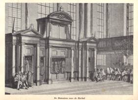 On the big canapés the sefarim are placed on two small raised platforms, because one is not allowed to sit on a bench with a Sefer resting on it (שו"ע יו"ד רפ"ב ז' ובית יוסף שם) On the right ladies gallery (“Meijerplein” side) two chairs are placed for the two Callot, Callat Tora left and Bereshit right (seen from below).