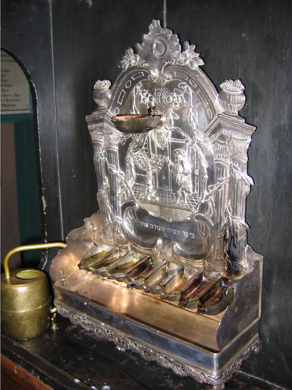 Abraham Pharar was a doctor, born in Porto and practitioning in Lisbon. He fled the inquisition and went to Amsterdam, where he published a book on all commands (mitzwot) in 1627 in the Portuguese language. He died in 1663. (source: MHG pag. 31). Both Chanukiljes are used, each 4 days. They are placed on the south wall: on the doors in the big Snoge and on the fence in the small (winter) Snoge.