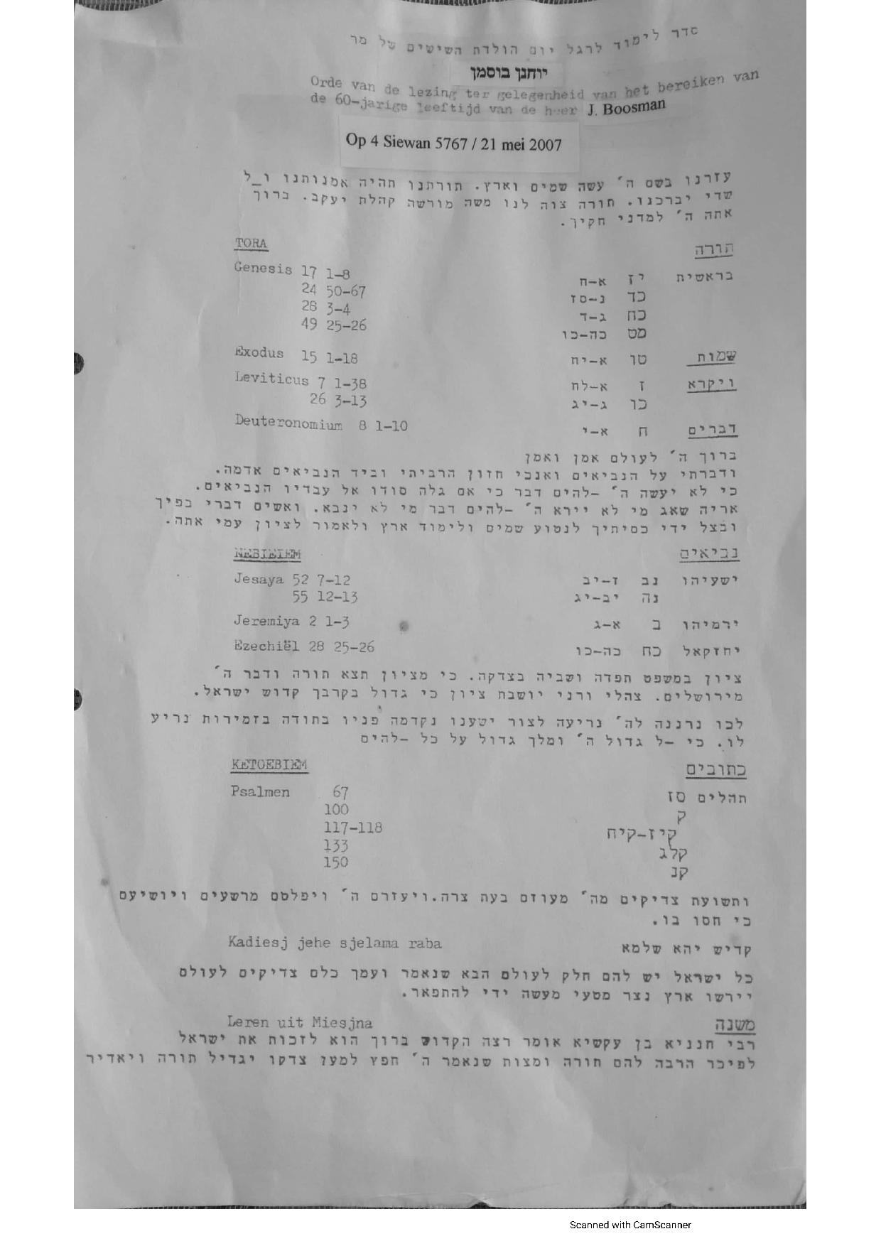 Limud for a SeniorAt special birthdays of a male (e.g. 60, 70 or 80) a limud is organized. The general structure is followed. The table below shows the specific texts. It is based on various booklets printed the last ten years. Some parts are sung when used