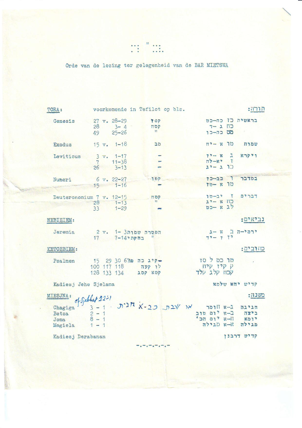 Lezing (Limud)A Limud is a learning gathering, preferably having a minjan, which can be organized at various occasions. Although we will, for convenience reasons, use the word Limud on this website, a Limud is called a “Lezing”, a Dutch word meaning “reading”. In some of the old booklets it is called a “Keri’ah”, the Hebrew word for “reading”. There are two types of occasions to organize a “Lezing”: